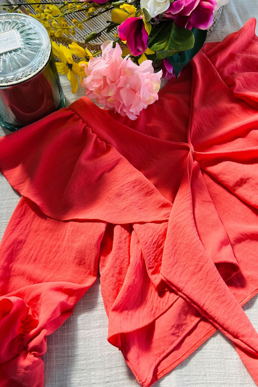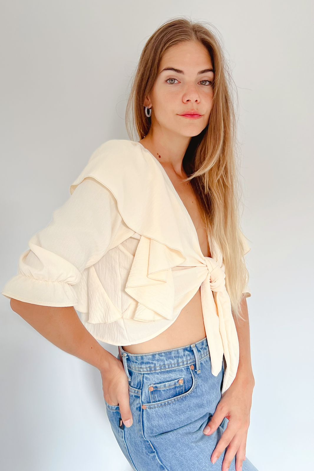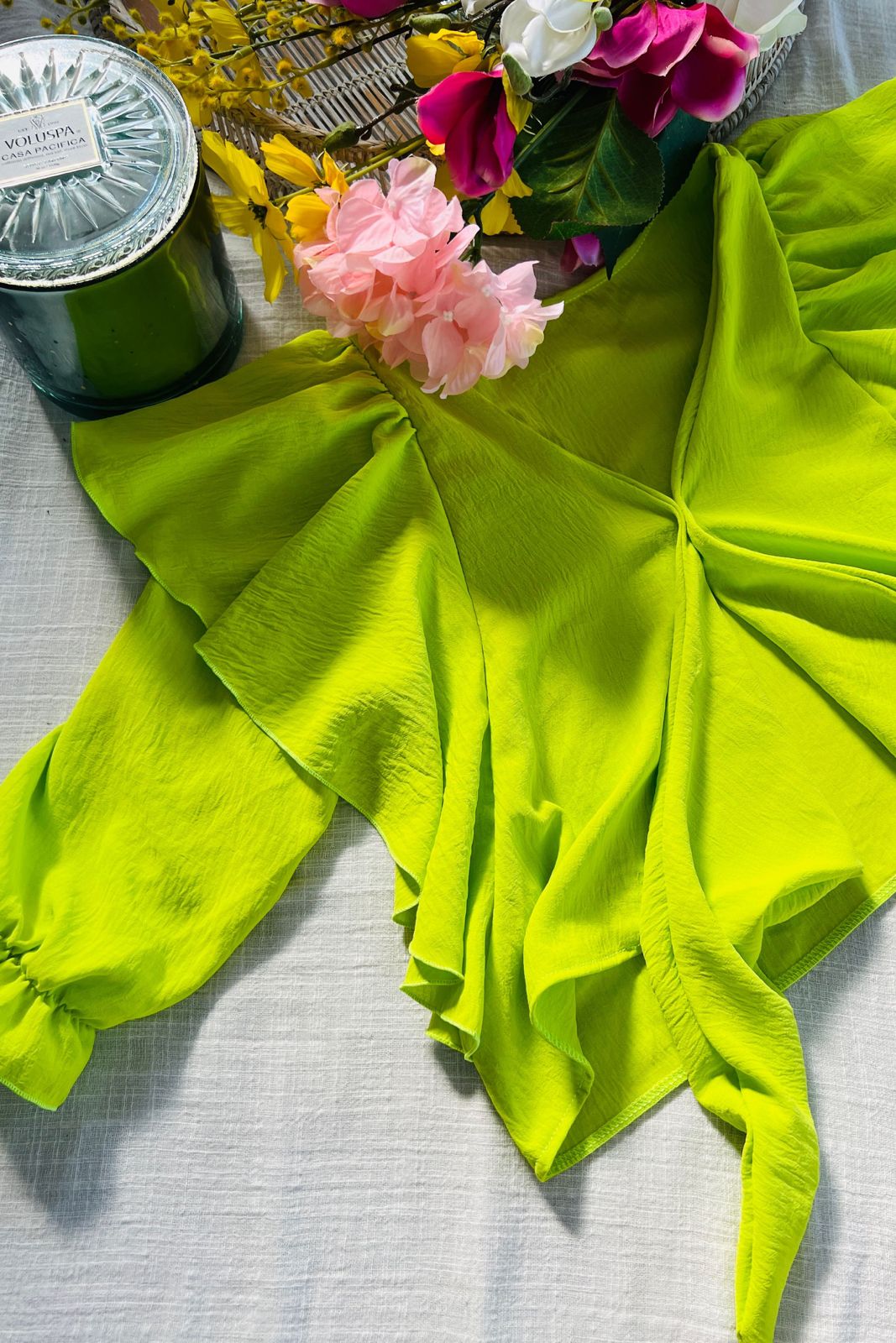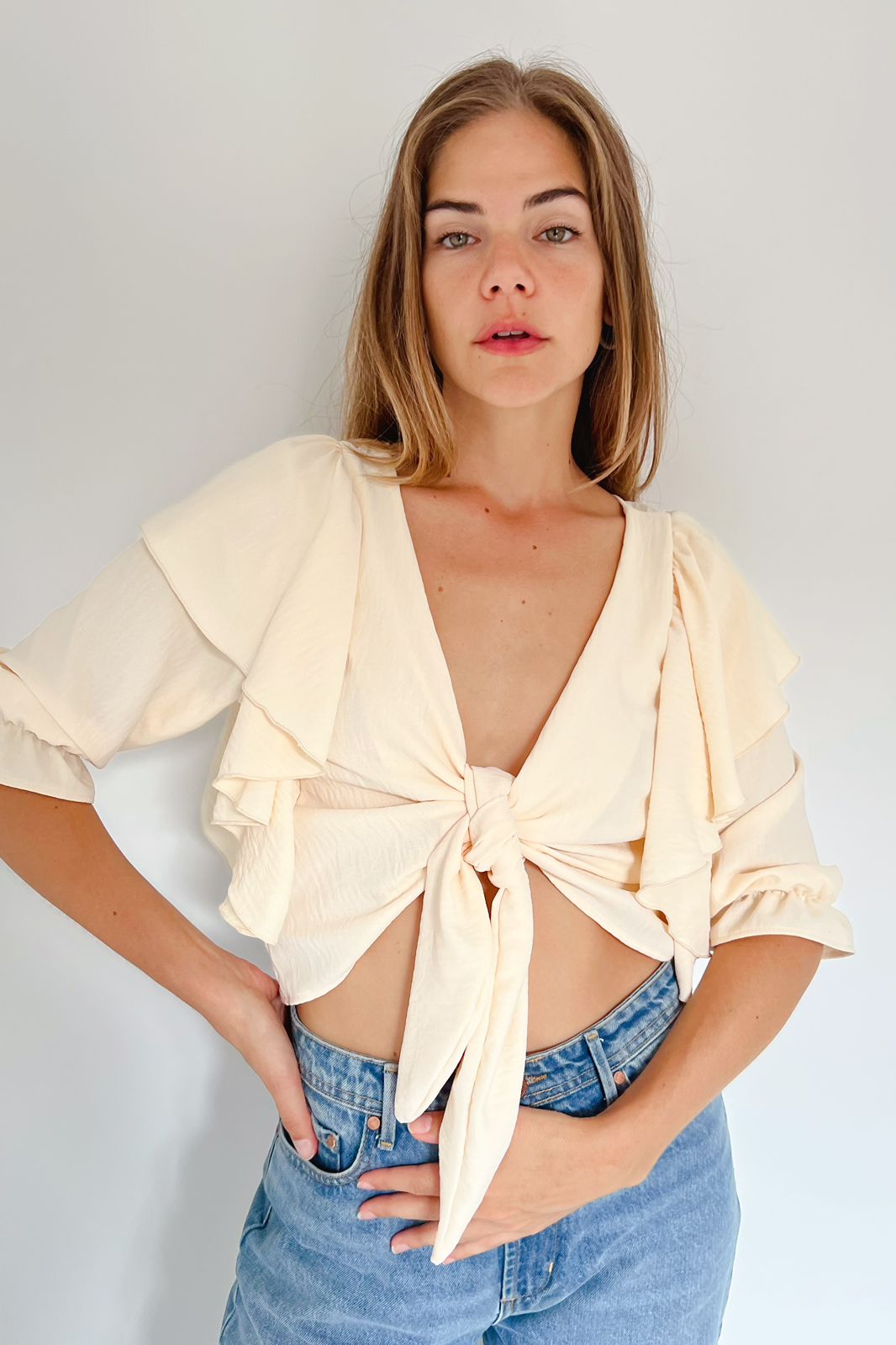 #Blusa #crep #USO REVERSIBLE #volados amplios #para atar #manga 3/4 #TALLE UNICO #TALLE L(la modelo mide 170cm y es 38 de jean, te servira de referencia)