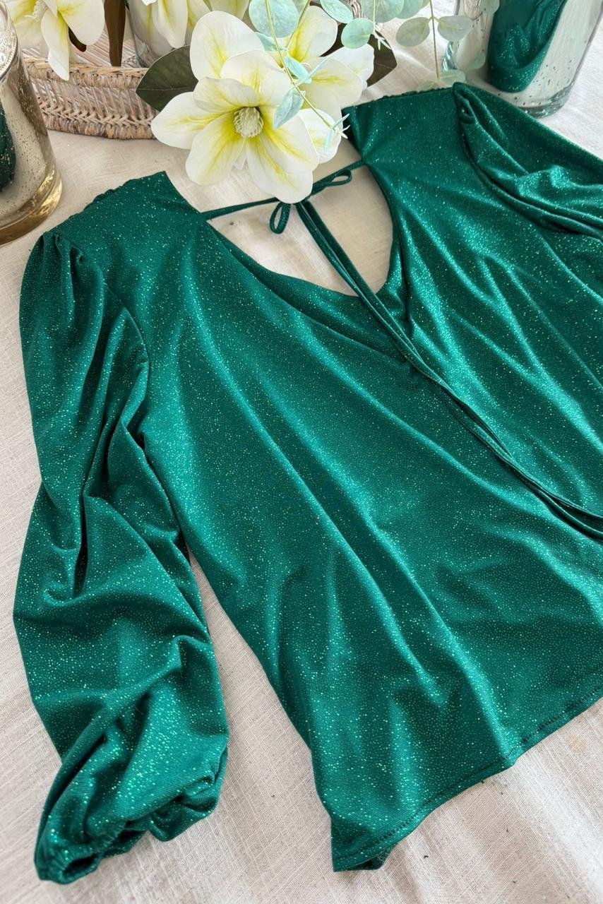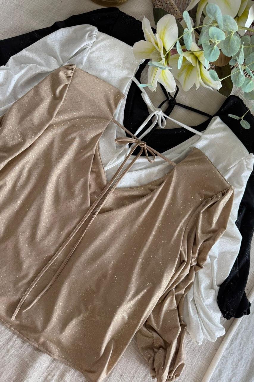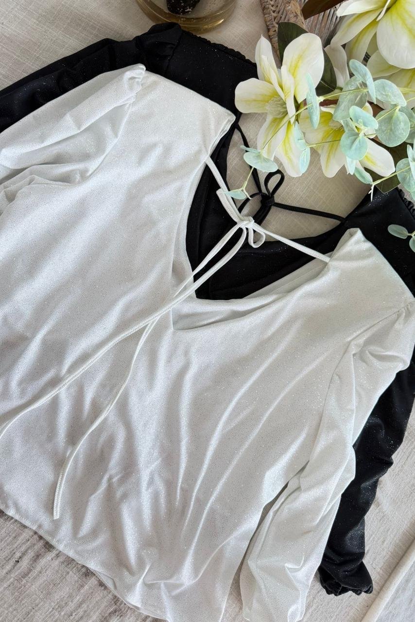 #Blusa escote V en delantera y espalda #hombreras #microfibra glitter #tiritas para atar en espalda #TALLE UNICO