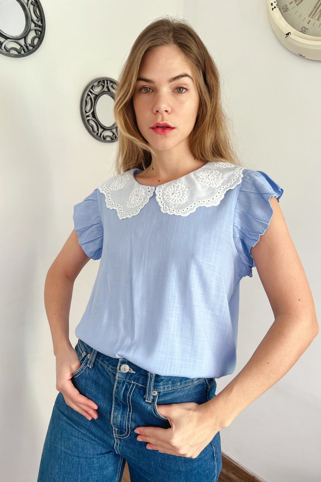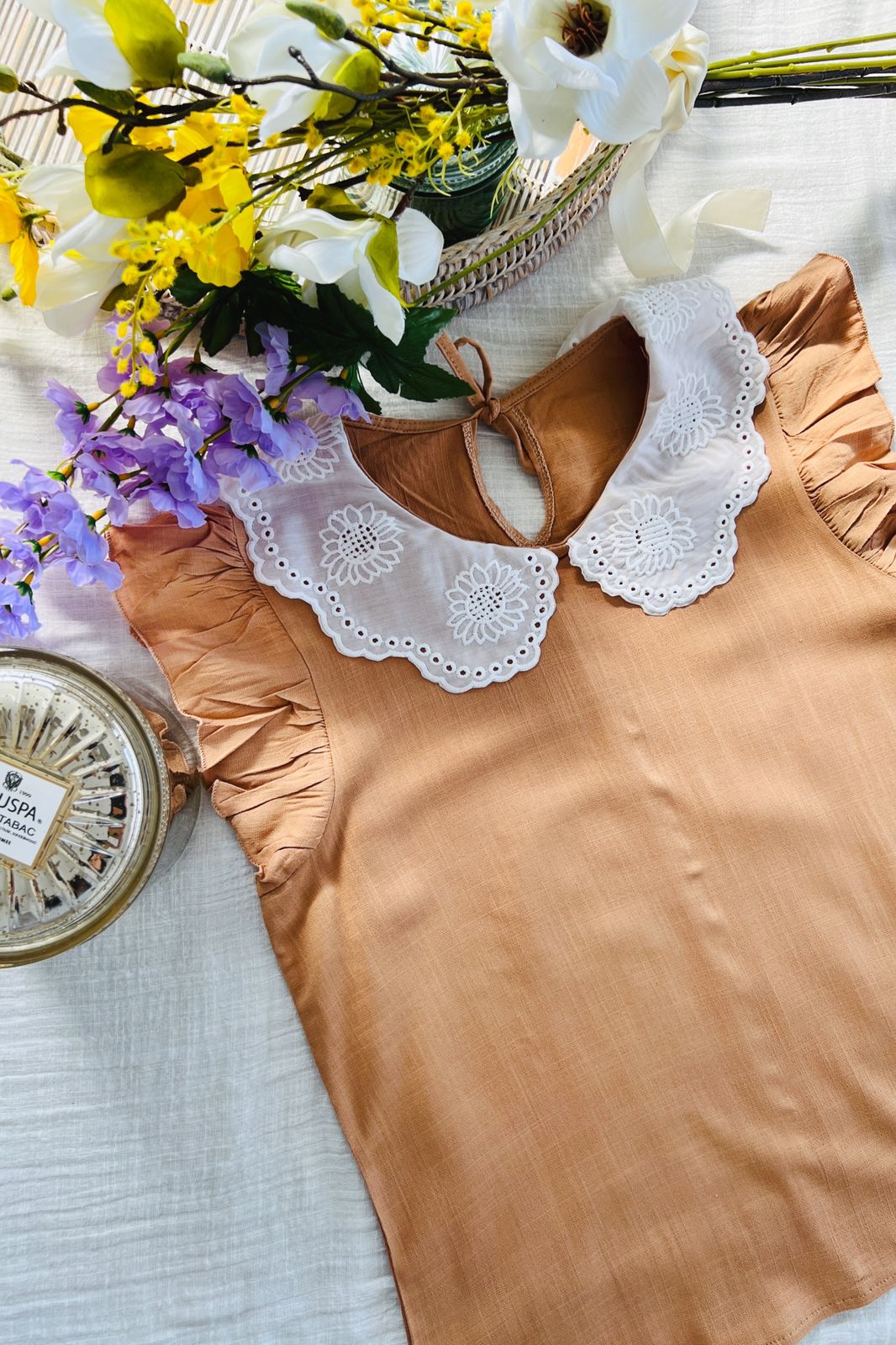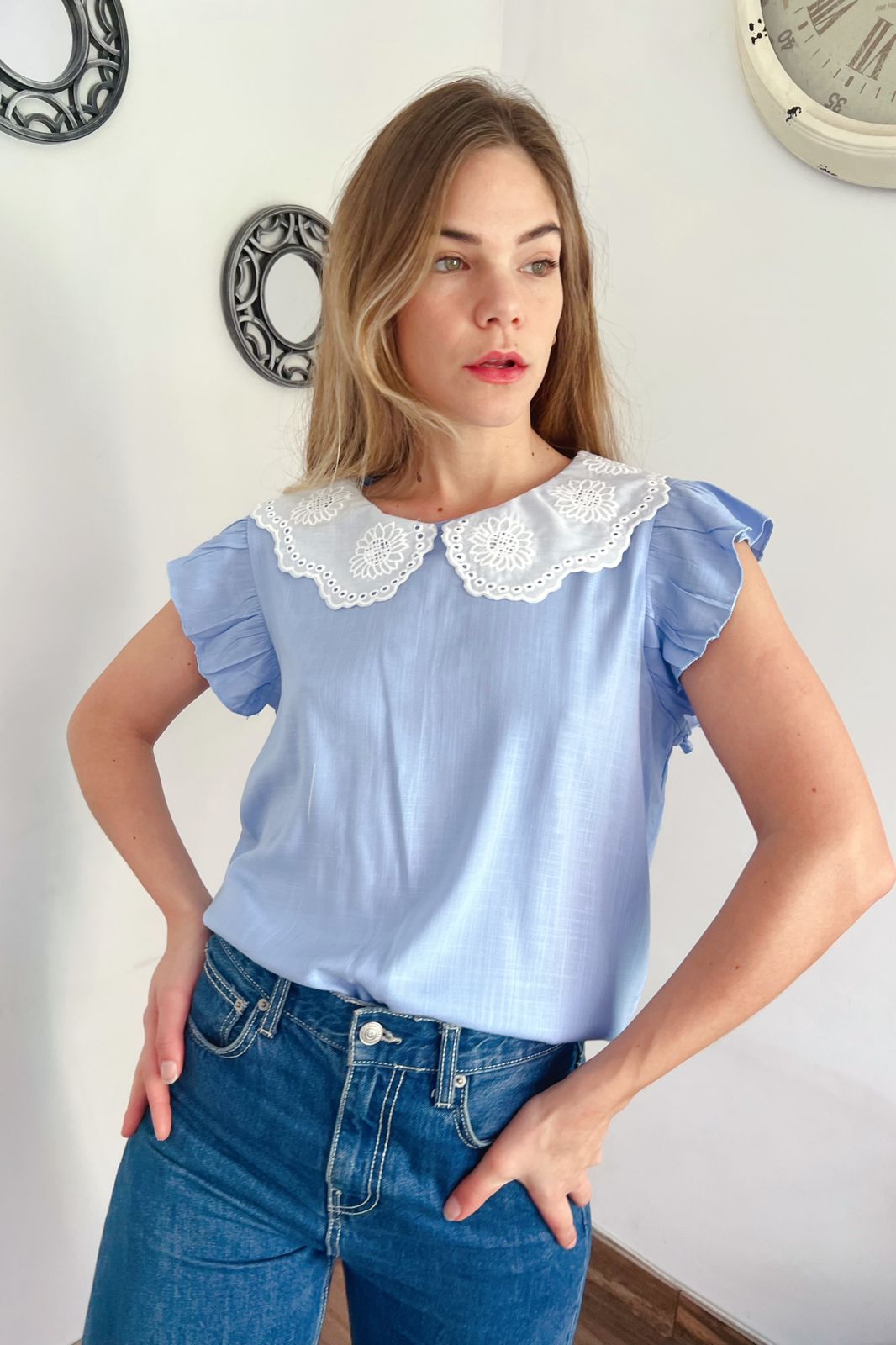 #Blusa #Cuello Bordado #Volado en Manga #Tipo Lino Elastizado #TALLE UNICO