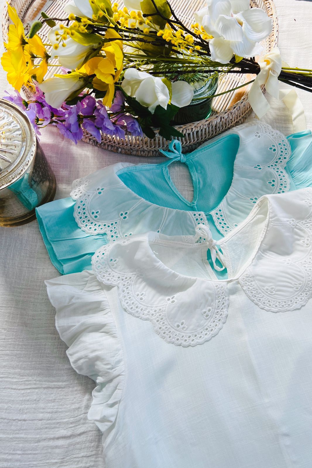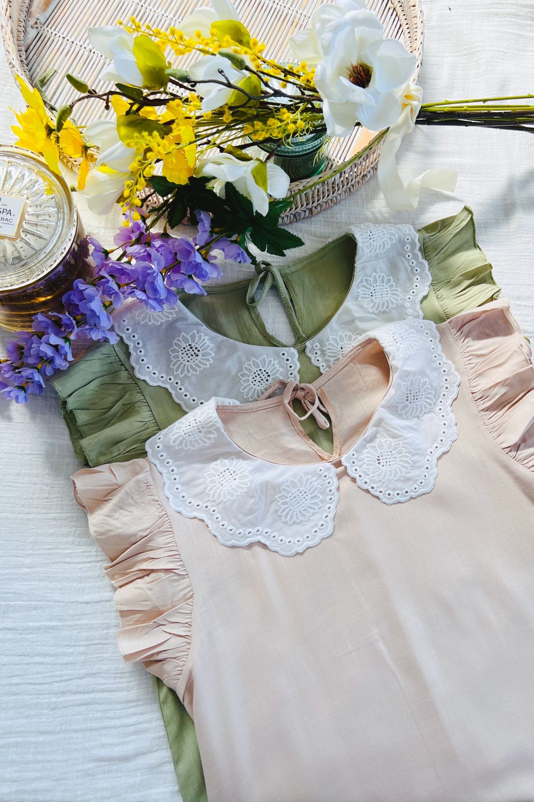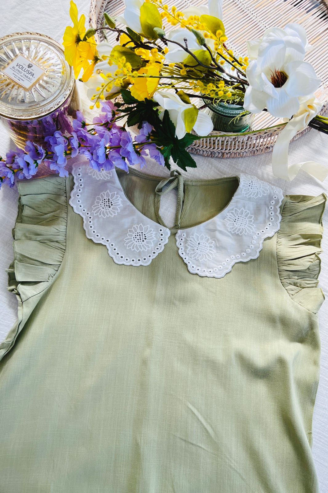 #Blusa #Cuello Bordado #Volado en Manga #Tipo Lino Elastizado #TALLE UNICO