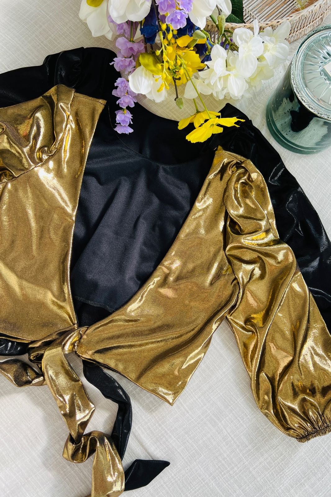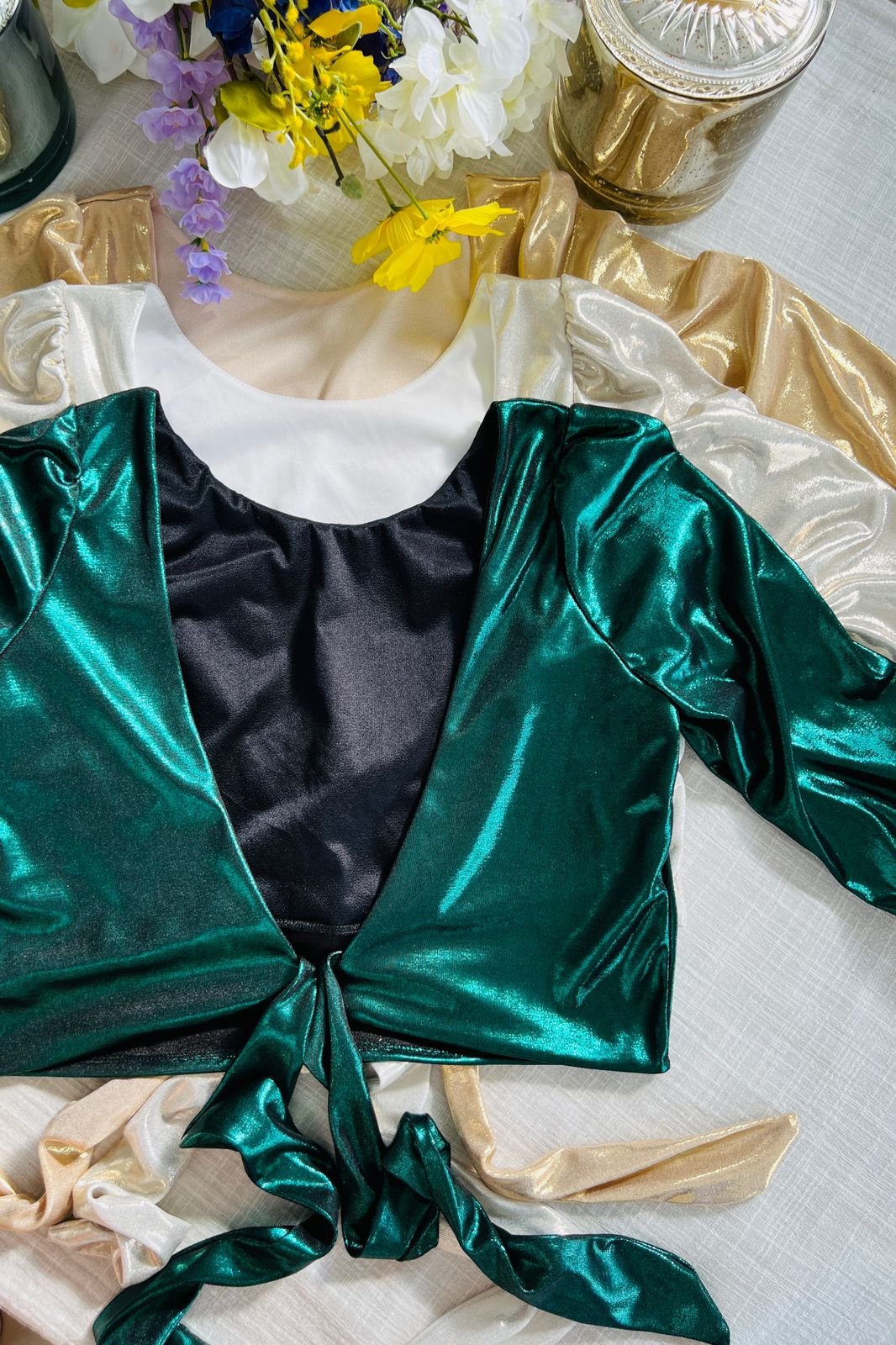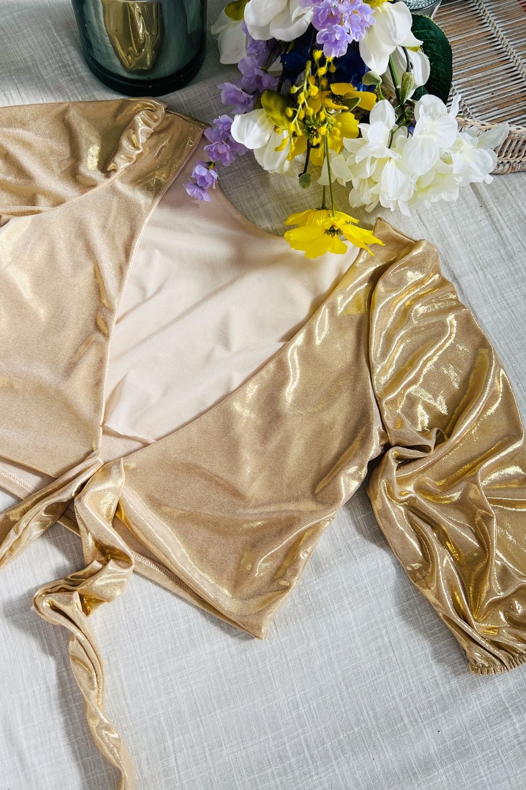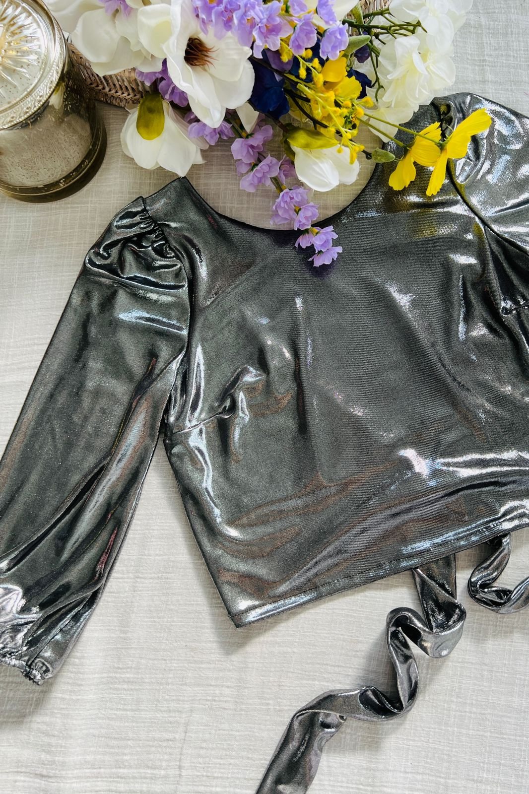 #Blusa #crep lino #manga 3/4 #manga globo #escote V delantero y espalda #tiras para atar #TALLE UNICO