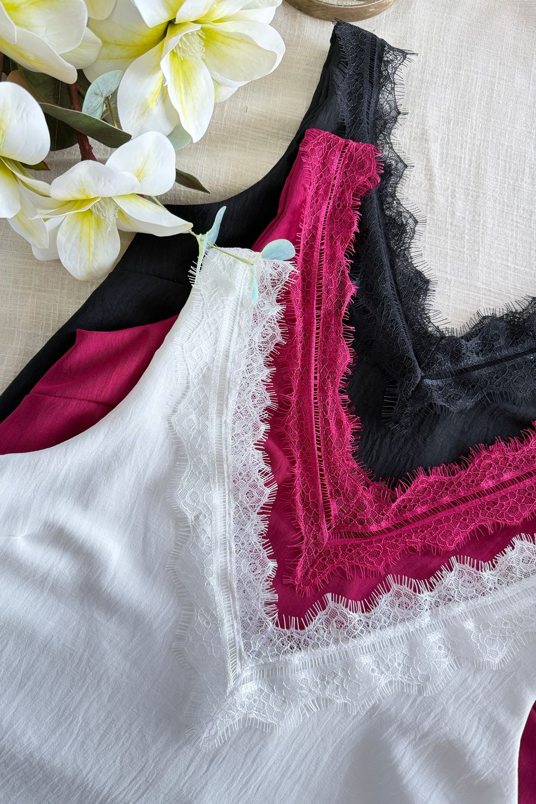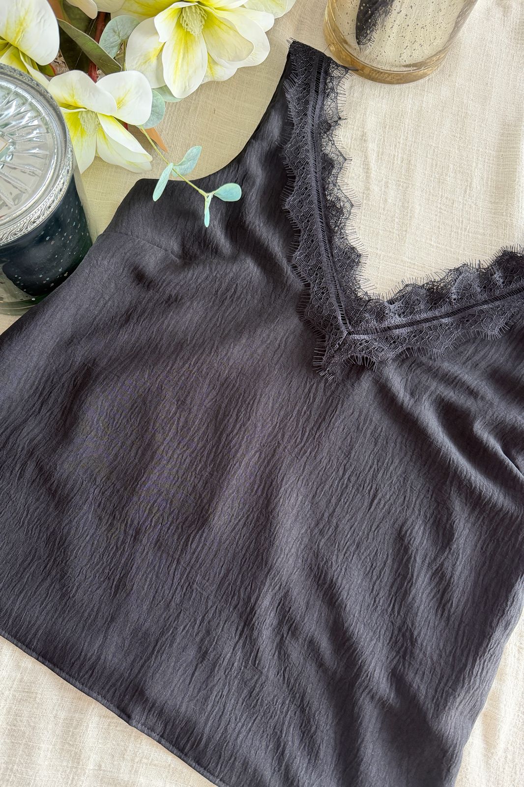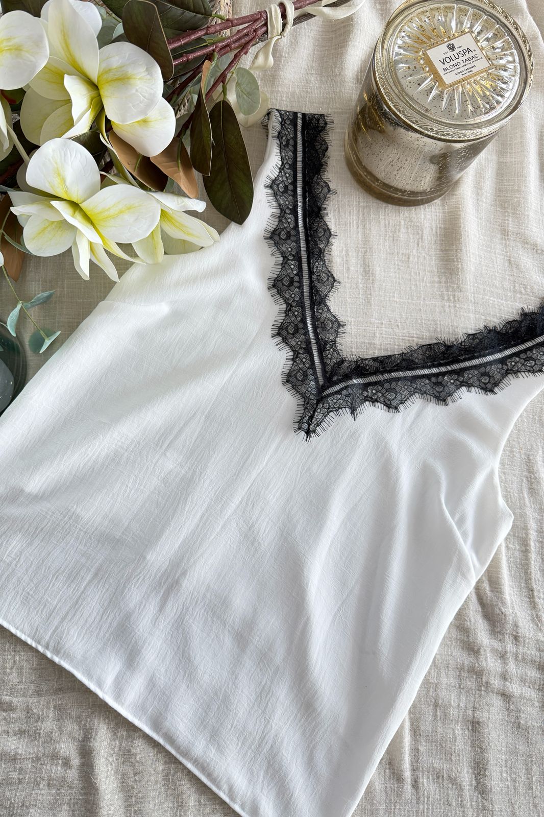 #Blusa #crep lino #escote V en delantera y espalda #puntilla en escote delantero y espalda #sin manga #TALLE UNICO