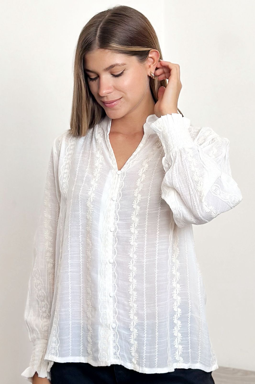 #Camisa #detalle aplique broderie en hombros #manga globo #fit amplio #alforzas en delantero #TALLE UNICO