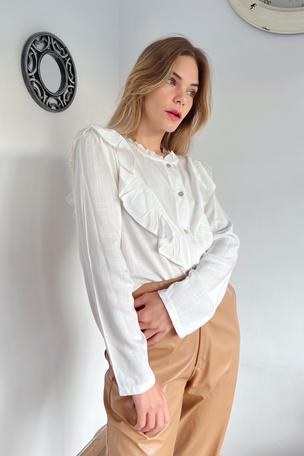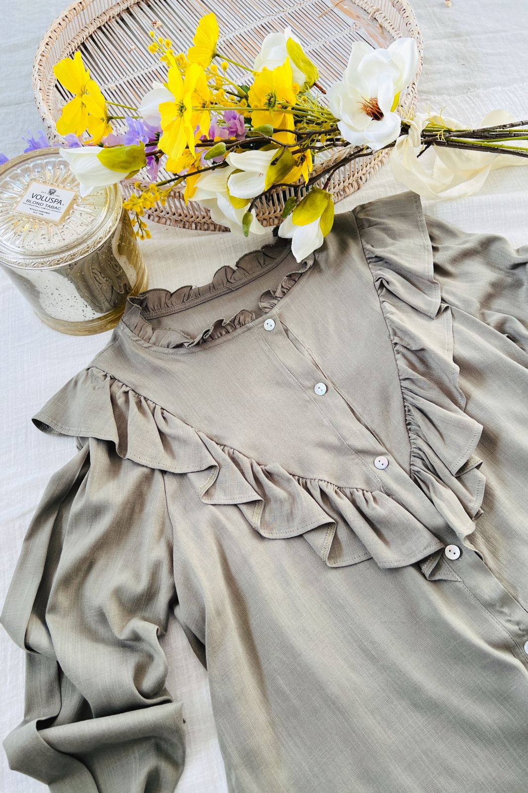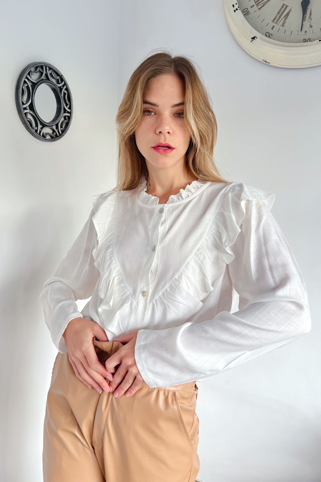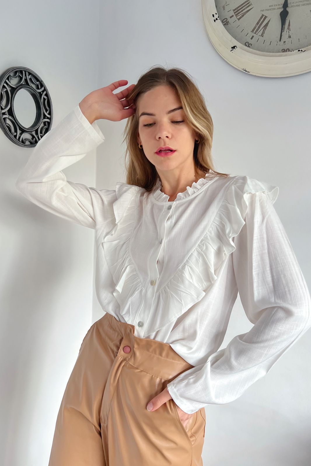 #Camisa #manga larga #simil lino #voladitos en cuello pecho y espada #TALLE UNICO