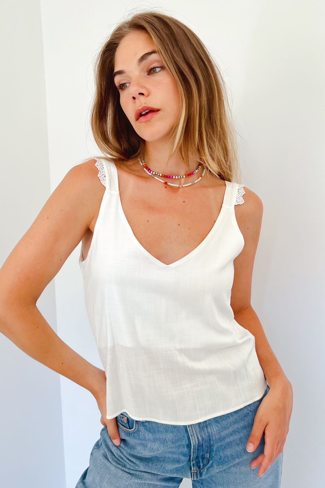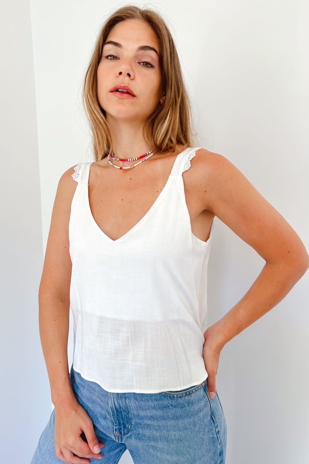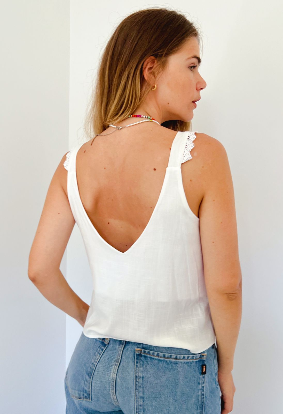 #Musculosa #simil lino #escote V #aplique en breteles #TALLE UNICO #TALLE M (la modelo mide 170 y es 40 de jean. te sirve de referencia)