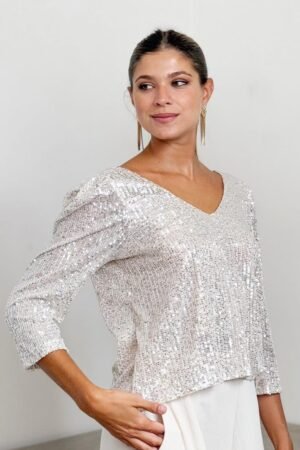 $21,000.00#Blusa #pailettes #escote V #voladitos en manga #TALLE UNICO